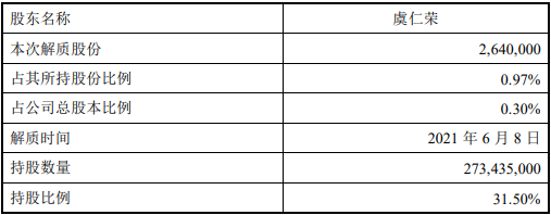 此外,虞仁荣及其一致行动人绍兴市韦豪股权投资基金合伙企业(有限合伙)、虞小荣共计持有公司股份3.55亿股,占公司总股本的40.89%;本次质押解除后,虞仁荣及其一致行动人累计质押公司股份1.76亿股,占其持有公司股份总数的49.53%,占公司总股本的20.25%