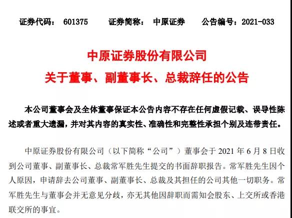 中原证券今日发布公告称,中原证券股份有限公司董事会于2021年6月8日收到公司董事、副董事长、总裁常军胜提交的书面辞职报告。常军胜先生因个人原因,申请辞去公司董事、副董事长、总裁及其担任的公司其他一切职务,公司常务副总裁朱建民代为履行总裁职责,期限至新任总裁正式就任之日止。