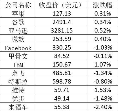 大型科技股走势分化,苹果、谷歌、亚马逊和微软股价均上涨,但涨幅均不到1%;Facebook和奈飞股价下跌,跌幅超过1%。