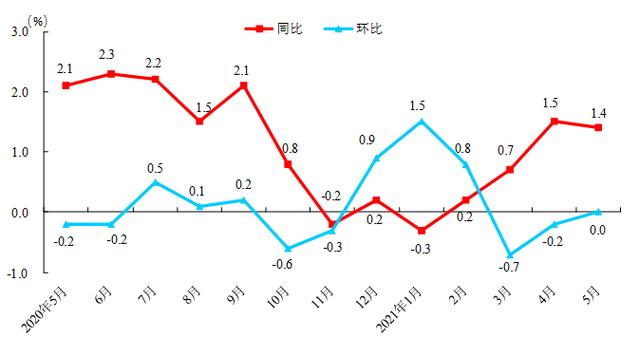 5月份,食品烟酒价格同比上涨1.9%,影响CPI(居民消费价格指数)上涨约0.51个百分点。食品中,蛋类价格上涨36.6%,影响CPI上涨约0.21个百分点;鲜菜价格上涨11.9%,影响CPI上涨约0.18个百分点;水产品价格上涨10.7%,影响CPI上涨约0.32个百分点;鲜果价格上涨3.8%,影响CPI上涨约0.11个百分点;粮食价格上涨2.4%,影响CPI上涨约0.04个百分点;畜肉类价格下降9.8%,影响CPI下降约0.35个百分点,其中猪肉价格下降27.5%,影响CPI下降约0.40个百分点。5月份,其他七大类价格同比五涨二降。其中,交通通信价格上涨6.0%,衣着价格上涨2.9%,教育文化娱乐价格上涨0.4%,医疗保健价格上涨0.3%,生活用品及服务价格上涨0.1%;居住价格下降0.7%,其他用品及服务价格下降0.1%。