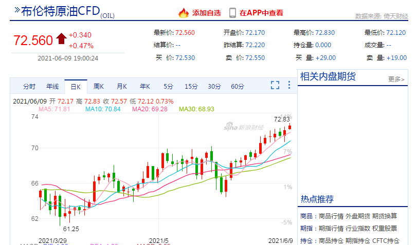 布伦特原油期货同样延续涨势,截至北京时间19时,上涨0.47%,报72.56美元/桶,创下2019年5月以来新高。昨日布伦特原油期货上涨0.84%,收于72.04美元/桶。