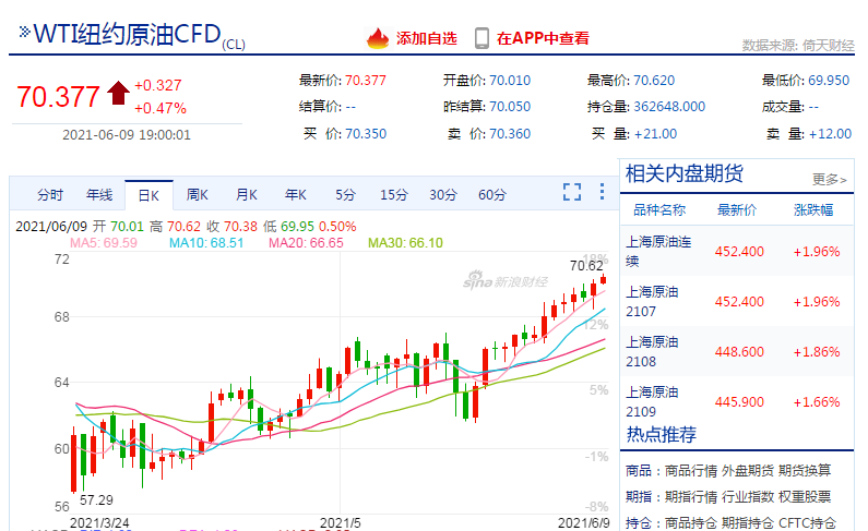 截至北京时间19时,WTI原油期货价格上涨,报70.377美元/桶,创下自2018年10月以来的新高。前一日WTI原油期货价格也小幅上涨,以69.29美元/桶开盘,盘中最高触及70.27美元/桶,最终收于70.03美元/桶,涨幅为1.18%。