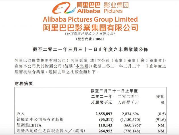 【TechWeb】6月10日消息,昨日晚间,阿里影业发布2020/2021财年业绩公告。在截至2021年3月31日的12个月报告期内,阿里影业收入达到28.59亿元,经调整EBITA首次扭亏为盈,报告期内实现盈利1.18亿元。