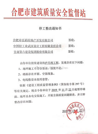 2019年11月,合肥市建筑质量安全监督站下发的停工整改通知书 来源:合景庐月湾业主