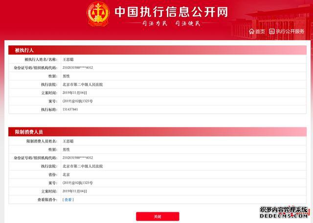 王思聪于11月4日被北京市第二中级人民法院列为被执行人,执行标的1.5亿余元。之后,中国执行信息公开网查询显示,法院已在11月19日向王思聪下达了限制消费令。
