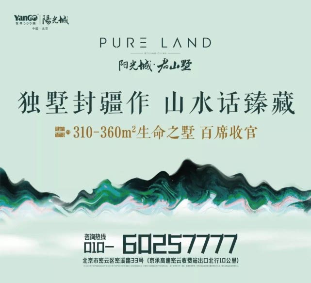 阳光城·君山墅建筑面积约310-360㎡河畔独栋,臻席敬献,以全新生活方式缔造中国北京·艺术生态墅区。联系电话:010-60257777