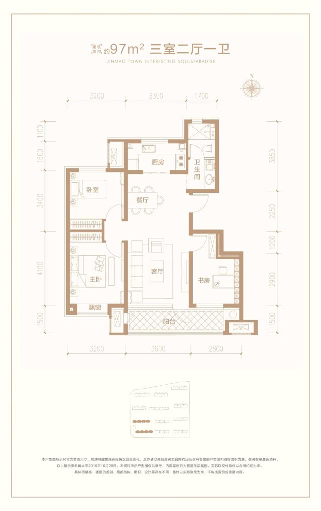 建面约97㎡户型为三室两厅一卫全明户型,三面宽朝南,南向有一个超大阳台,观景效果及居住体验很棒。