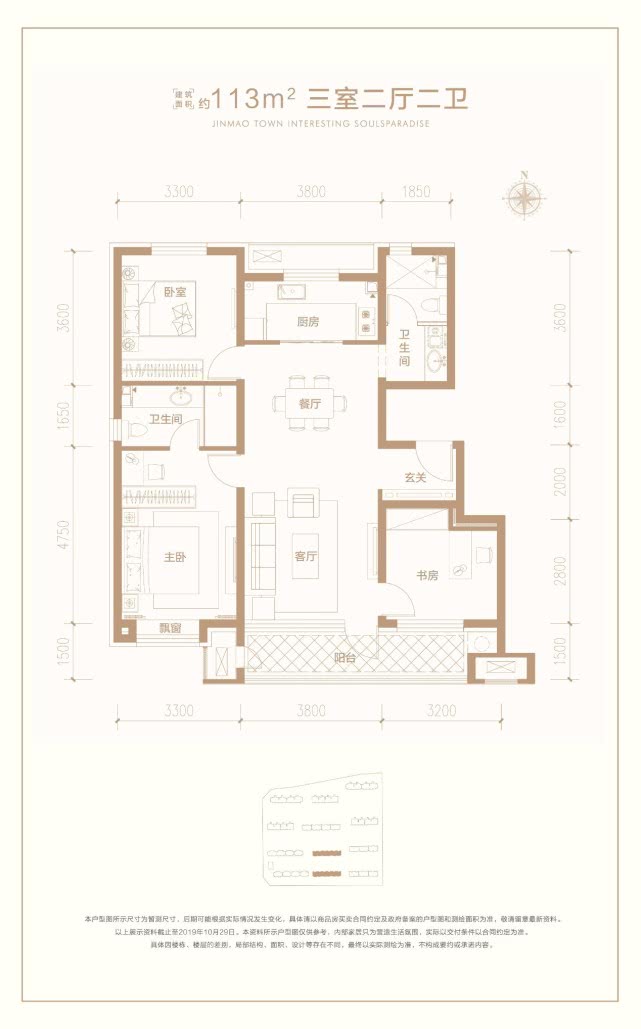 建面约113㎡户型为三室两卫两厅全明户型,格局与97㎡类似,但是面宽尺度更大。入户玄关设计,既保证了居家生活的私密性,也增加了归家的仪式感。