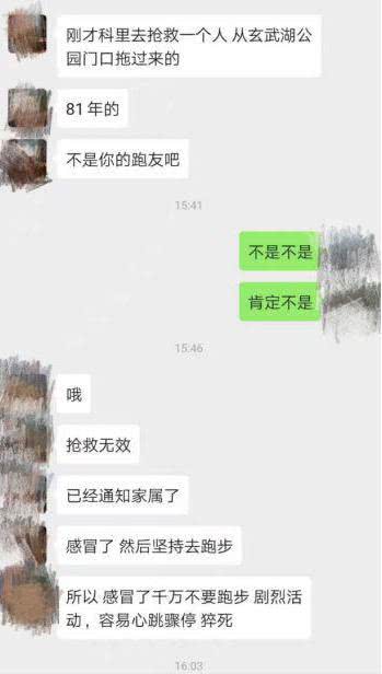 截图中的疑似医生的一方也表示:抢救无效,主要是因为感冒后坚持跑步,同时表示,感冒千万不要跑步和剧烈活动,这容易导致心脏骤停和猝死。
