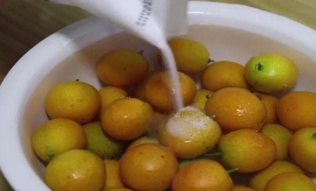 放入盐,洗一下金桔外边的蜡,把金桔的叶梗摘掉。