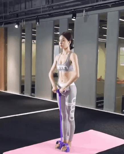 站姿拉伸主要是为了锻炼我们的手臂,双手握住手柄就向上提拉,提到胸前位置停止3~5秒,重复图中这个动作每天进行4节,每组15~20个,一段时间过后就会发现手臂有明显的改变。