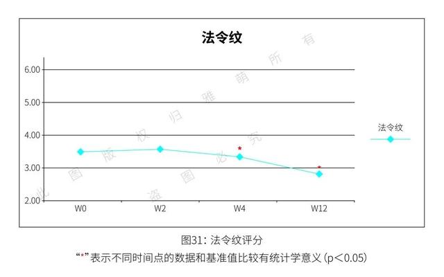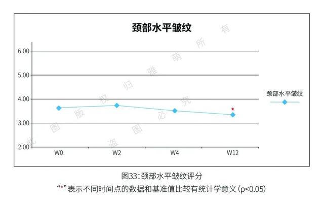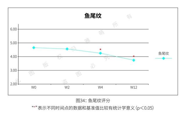 除了仪器测试,还有一位皮肤科专家对受试者的皮肤状况进行了专业的临床评估。各项评估分数结果显示:使用雅萌ACE 美容仪 12 周后,受试者的法令纹平均降低了 19%,前额纹降低了 15.14%,颈部水平皱纹淡化 18.21%。鱼尾纹降低了 18.21%。