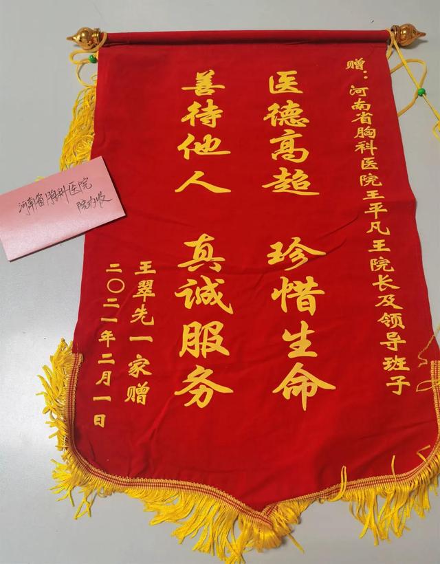 术后一个月,早已出院的王姨身体恢复不错,远在深圳的儿女专程寄来锦旗对河南省胸科医院医护人员表达感激之情。