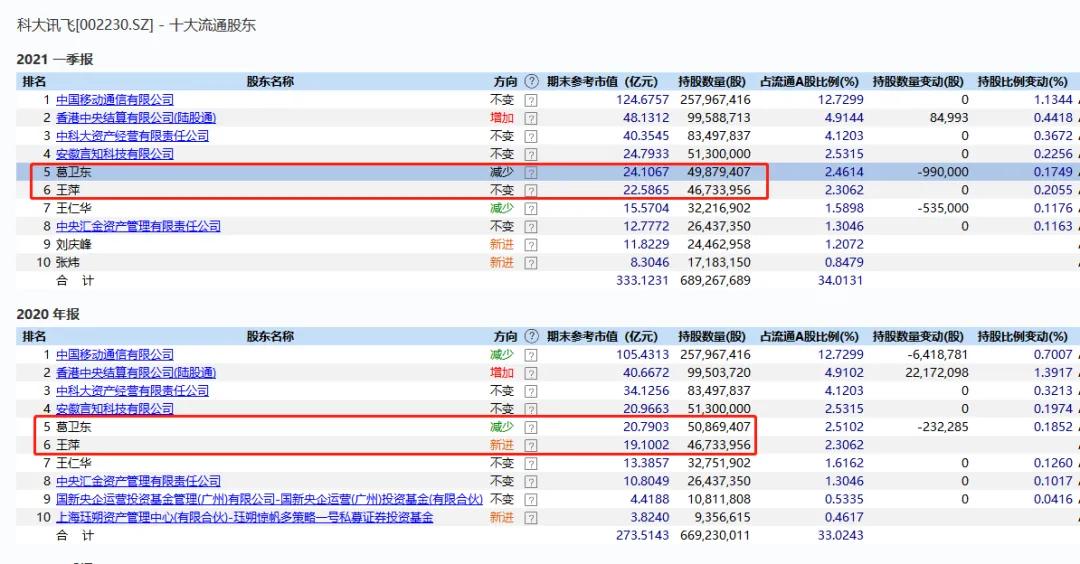 昨日晚间,科大讯飞一同发布2020年年报及2021年一季报,定期报告中披露出知名私募大佬葛卫东以及疑似其家属王萍的投资动向,名为王萍的账户在去年四季度大举加仓科大讯飞。然而今年一季度,股东葛卫东稍微进行了减持,减持99万股,王萍账户今年一季度持股不变。