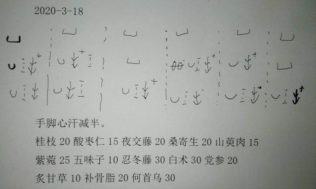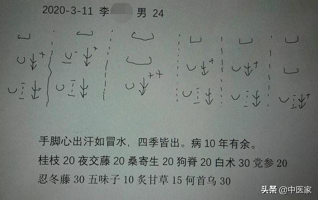 病人李某,男,24岁。手脚心出汗如冒水,四季皆出。病10年有余。凭脉辨证后,处方5剂,复诊自诉效果明显,症状减半。脉象及处方如下: