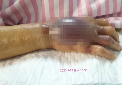 据了解,患者潘阿姨,因海鲜刺伤右手导致右上肢骨筋膜室综合征并坏死、右上肢感染、脓毒症、脓毒性休克、肺炎、呼吸衰竭等症状,之后被送往医院进行救治。