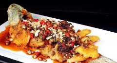 香辣脆皮鱼 制法: 1.草鱼宰杀治净,斜刀把两侧的鱼肉片成厚片,纳盆加盐、味精和干锅酱腌30分钟。 2.锅里放色拉油烧至五成热,把鱼头和鱼片与脆皮糊拌匀,下油锅炸至外表酥脆且