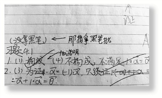 偶尔有学生用红笔写作业,并留言“没拿黑笔”,张洪申在一旁批注:“那我用黑笔改。”