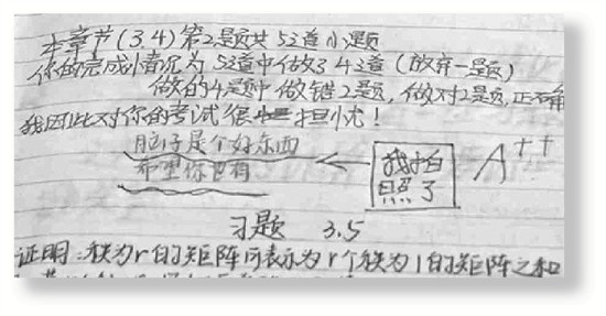 “有次考试,我在做一道题的解答时,写了整整两页纸。而老师把两页纸中,每个有问题的地方都圈了出来,还写了正确的方法。我特别感动,学这门课也就特别用心,后来期末考试我考了很高的分数。我觉得这种方法特别好。”