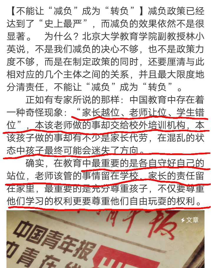 最近北京大学教育学院副教授孙小英就表示:不是我们减负的决心不够,也不是政策力度不够,而是在制定政策的同时,还要理清楚与此相关的几个主体之间的关系,并且最大限度地分清责任,不能让减负成为转负!正如专家说的一样――家长越位,老师让位,学生错位!本来该老师做的事情,老师没有做好,本来该孩子做的事情家长却代劳了!