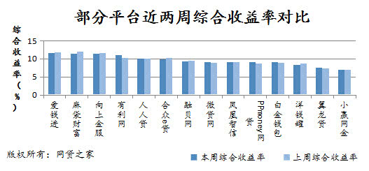 本周网贷行业平均投资综合收益率为9.28%,环比上周下降了12个基点(1个基点=0.01%)。在选取的成交量较大的平台中,有利网上涨幅度最大,涨幅为83个基点,PPmoney网贷、微贷网、白金钱包分别上涨32、23、9个基点。相反,麻袋财富、合众e贷、洋钱罐、爱钱进分别下降46、43、38、21个基点。其余平台收益率相对波动较小。