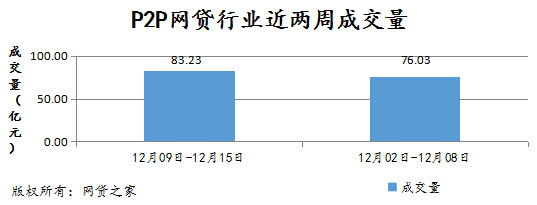 本周P2P网贷行业累计成交量达83.23亿元,环比上周(12月02日-12月08日)76.03亿元上升了9.47%。