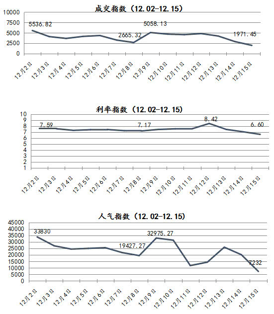 本周(12月09日-12月15日)P2P网贷成交指数、利率指数上升,人气指数下降。成交指数和利率指数升幅分别为1.91%、0.80%,人气指数降幅为18.80%。利率最低时(12.15)为6.60点。