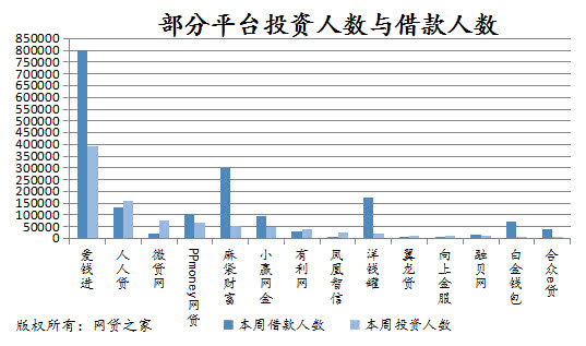 本周活跃投资人数和活跃借款人数分别达93.30万人和177.25万人。其中活跃投资人数环比上周下降了4.91%,活跃借款人数环比上周上升了1.97%。在成交量较大的平台中,就投资人数角度看,合众e贷、微贷网、洋钱罐、向上金服分别上涨24.70%、23.25%、18.39%、15.54%。有利网、人人贷、凤凰智信分别下跌53.78%、9.36%、5.01%。借款端方面,有利网、洋钱罐、微贷网、向上金服分别上涨46.10%、32.07%、31.10%、19.10%。凤凰智信、PPmoney网贷、合众e贷、白金钱包分别下跌34.04%、20.61%、15.08%、10.19%。其余平台活跃投资人数和借款人数相比波动幅度较小。