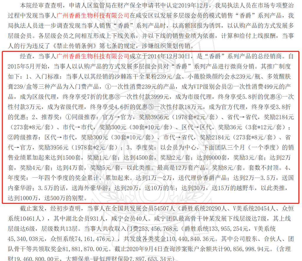 广州香爵公司等因涉嫌传销被冻结8188.19万元