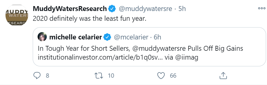 一篇公开披露其业绩的报道援引投资者称,2020年该基金业绩回报为15%。浑水自己的推特账号也将其转发,侧面显示出对这一业绩真实程度的肯定。
