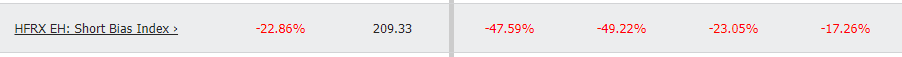 业内数据显示,截止去年11月底的一年内,做空基金指数下跌49.22%,将近腰斩