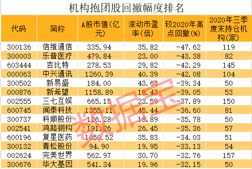 证券时报·数据宝统计显示,2020年三季度末持仓机构50家以上的股票中,有43股滚动市盈率超百倍,包括海天味业、山西汾酒、天赐材料、亿纬锂能、药明康德等。与此同时,依然有不少机构抱团股市盈率处于较低水平。