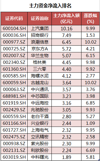 具体到个股来看,46股主力资金净流入超亿元。其中,上汽集团、招商银行、浪潮信息、京东方A、华兰生物主力资金净流入居前,净流入金额分别为10.16亿元、7.49亿元、6.45亿元、5.72亿元、5.07亿元。