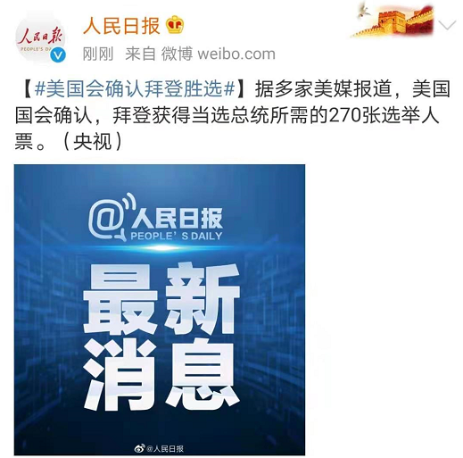据多家美媒报道,美国国会于当地时间1月6日举行参众两院联席会议,完成选举人票的清点工作。经统计,拜登共获得306张选举人票,已获得超过胜选所需的270张选举人票。联席会议主席、美国副总统彭斯主持会议并宣布乔·拜登在美国总统大选中获胜。