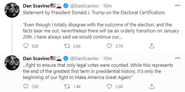 而另一边,白宫助手Dan Scavino发推称,特朗普表示,“尽管我完全不同意选举的结果,而事实也证明了我的观点,但1月20日我将有序交接权力。我一直表示,我们会继续为确保只计算合法选票而奋斗。虽然这代表了总统历史上最伟大的第一任期的结束,但这只是我们让美国再次伟大的斗争的开始!”