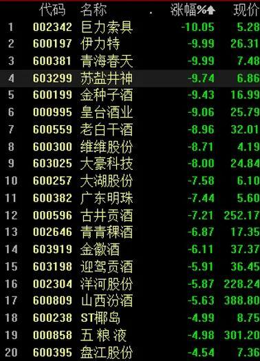 涉及白酒概念的个股纷纷大跌,巨力索具、伊力特、青春海天、ST椰岛跌停。包括山西汾酒、洋河股份在内的17只个股跌超5%。板块内仅酒鬼酒、口子窖、贵州茅台微涨。