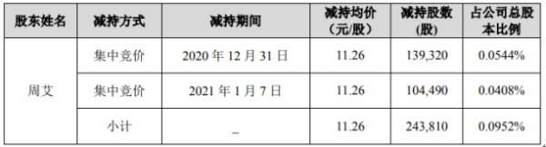 截至本公告日,股东周艾在深圳证券交易所通过竞价交易方式完成24.38万股的减持,权益变动前周艾持股0.22%,权益变动后持股比例为0.12%。