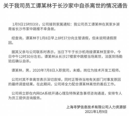 通报称,谭某林为男性,2020年7月8日入职拼多多,目前未婚。据其父亲与拼多多联系时表示,1月8日下午于长沙机场接谭某林至家中,今日中午12时30分左右,谭某林从长沙27楼家中跳楼当场离世,法医到场勘验后确认自杀。