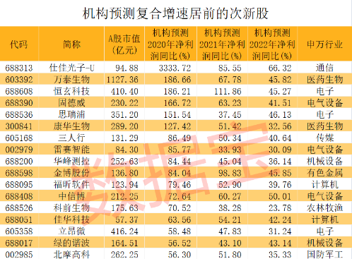 3只次新股2020年、2021年及2022年平均增速超过100%,分别是仕佳光子、恒玄科技、万泰生物。机构预测复合增速较高的还有固德威、思瑞浦、康华生物等。