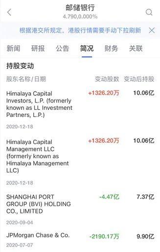 公开数据显示,2020年12月18日,Himalaya Capital Investors, L.P.及Himalaya Capital Management LLC、Li Lu(李录)等相关主体对邮储银行H股进行了加仓,变动后持股比例达到5.06%。