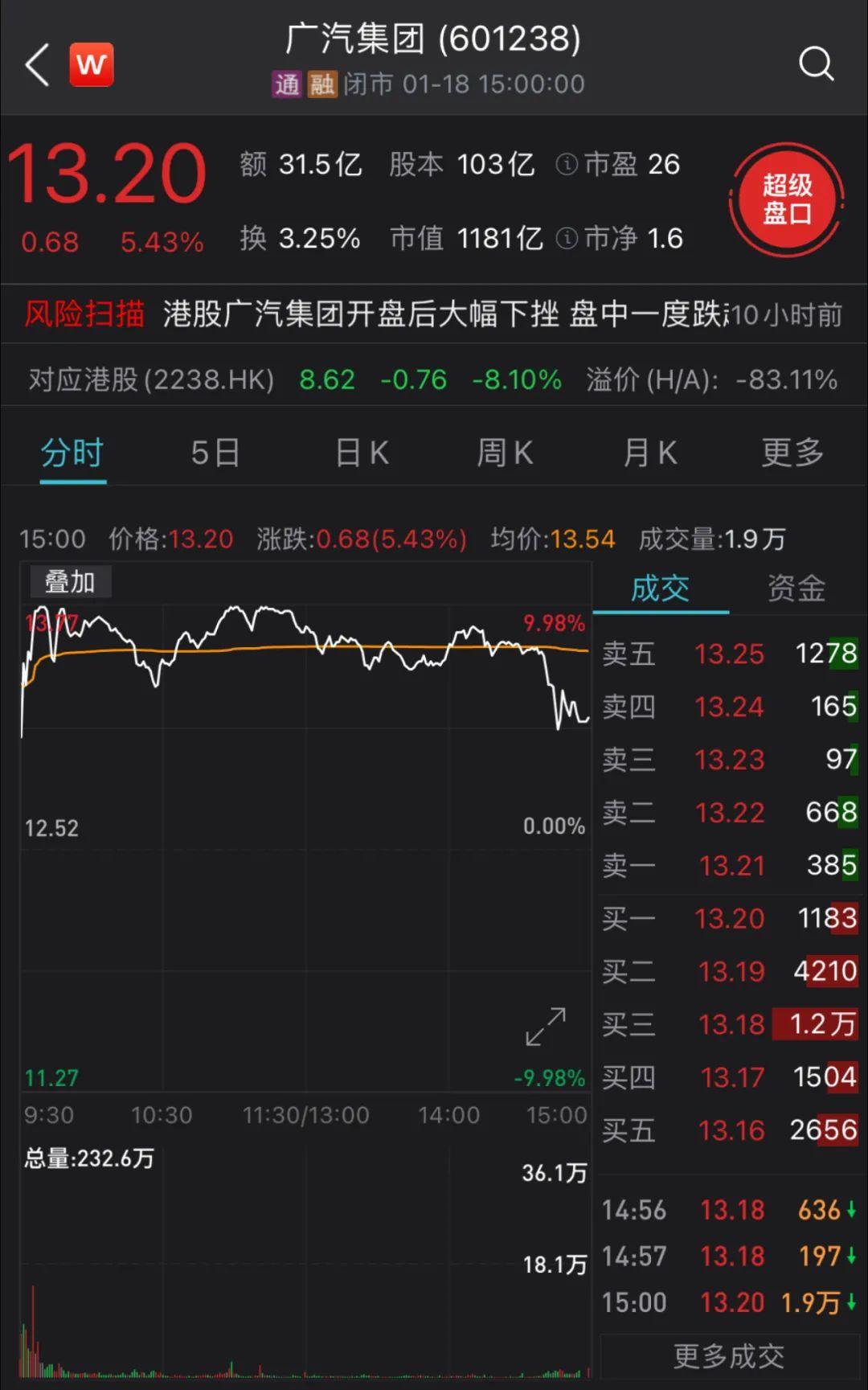 截至收盘,A股广汽集团收涨5.43%,报13.54元。