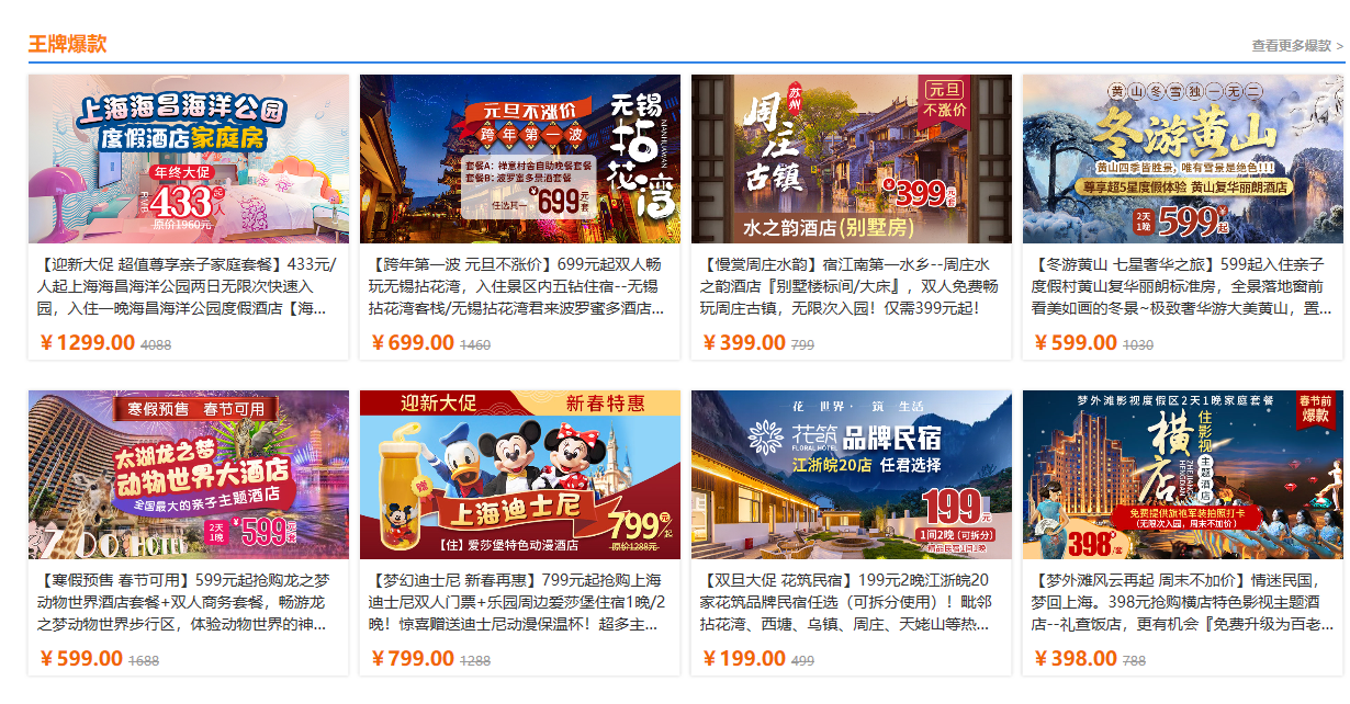 而除了上海迪士尼乐园的产品外,该平台上还有包括上海海昌海洋公园、太湖龙之梦动物世界、横店影视城等相关旅游景点加住宿的套票。