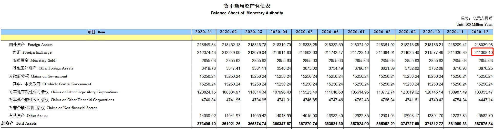 2020年12月末,央行口径外汇占款为211308.10亿元