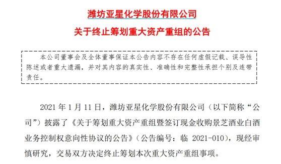 公告中称,ST亚星与景芝酒业于2021年1月9日签署完成《合作意向协议》,随后各方继续积极推进本次重大资产重组相关工作,就本次交易涉及的核心事项逐步深入洽谈。