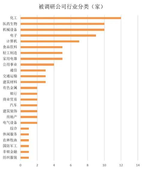 按行业分类看,被调研公司中,化工行业被调研的公司数量排名首位,累计12家公司被调研,另外,医药生物、机械设备两大行业被调研的数量也较多,均有10家公司获机构调研,并列次席。