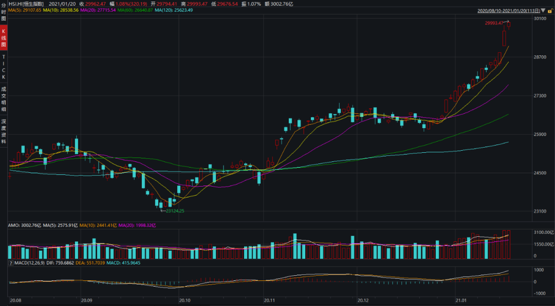南下资金爆发式流入港股背景下,港股恒生指数已经进入直线拉升态势。2021年第一个交易日起,恒生指数一路上行,截至1月20日的累计涨幅逼近10%,盘中最高点为29993点,距离30000点位置仅一步之遥。