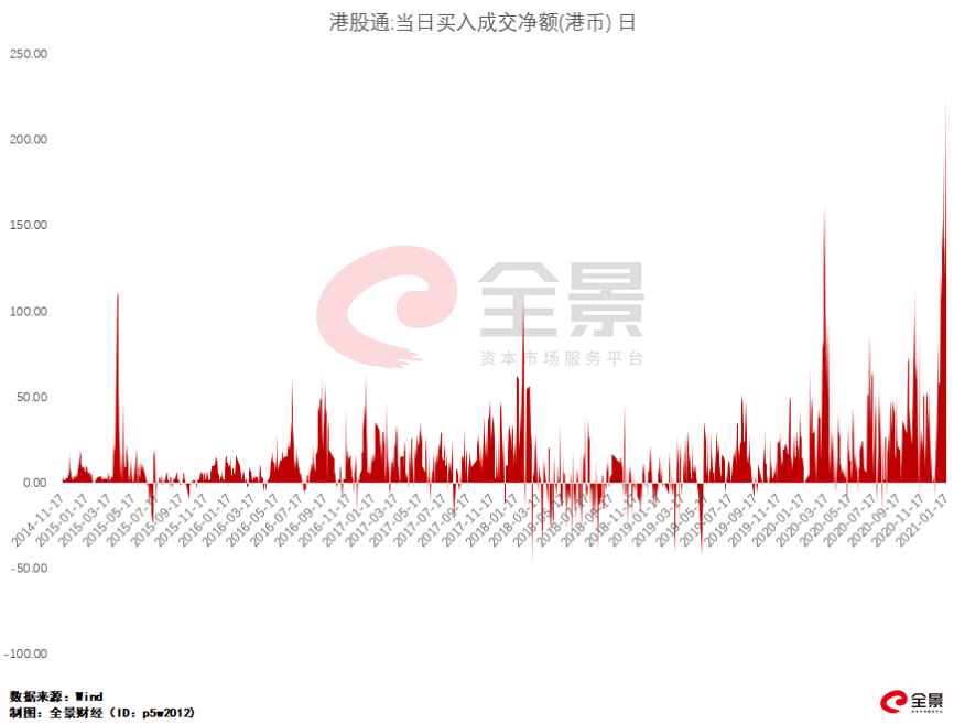 2021年1月19日,南向资金单日净流入超过265亿港元,创出了港股通开通以来的历史新高。在2021年刚过去的12个交易日中,南下资金累计扫货港股已经超4700亿港元,累计净流入高达1853亿港元,相比于2020全年港股通净流入6721亿港元的27.57%。