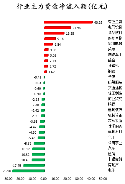 从行业板块来看,申万所属的28个一级行业,有10个行业板块主力资金呈现净流入,其中,有色金属、电气设备、食品饮料、医药生物、家用电器行业板块主力资金净流入居前,净流入金额分别为40.19亿元、21.96亿元、16.38亿元、9.16亿元、6.84亿元;18个行业板块主力资金呈现净流出,其中,电子、房地产、非银金融、通信、汽车行业板块主力资金净流出较多,净流出金额分别为26.9亿元、17.45亿元、10.46亿元、10.32亿元、10.12亿元。