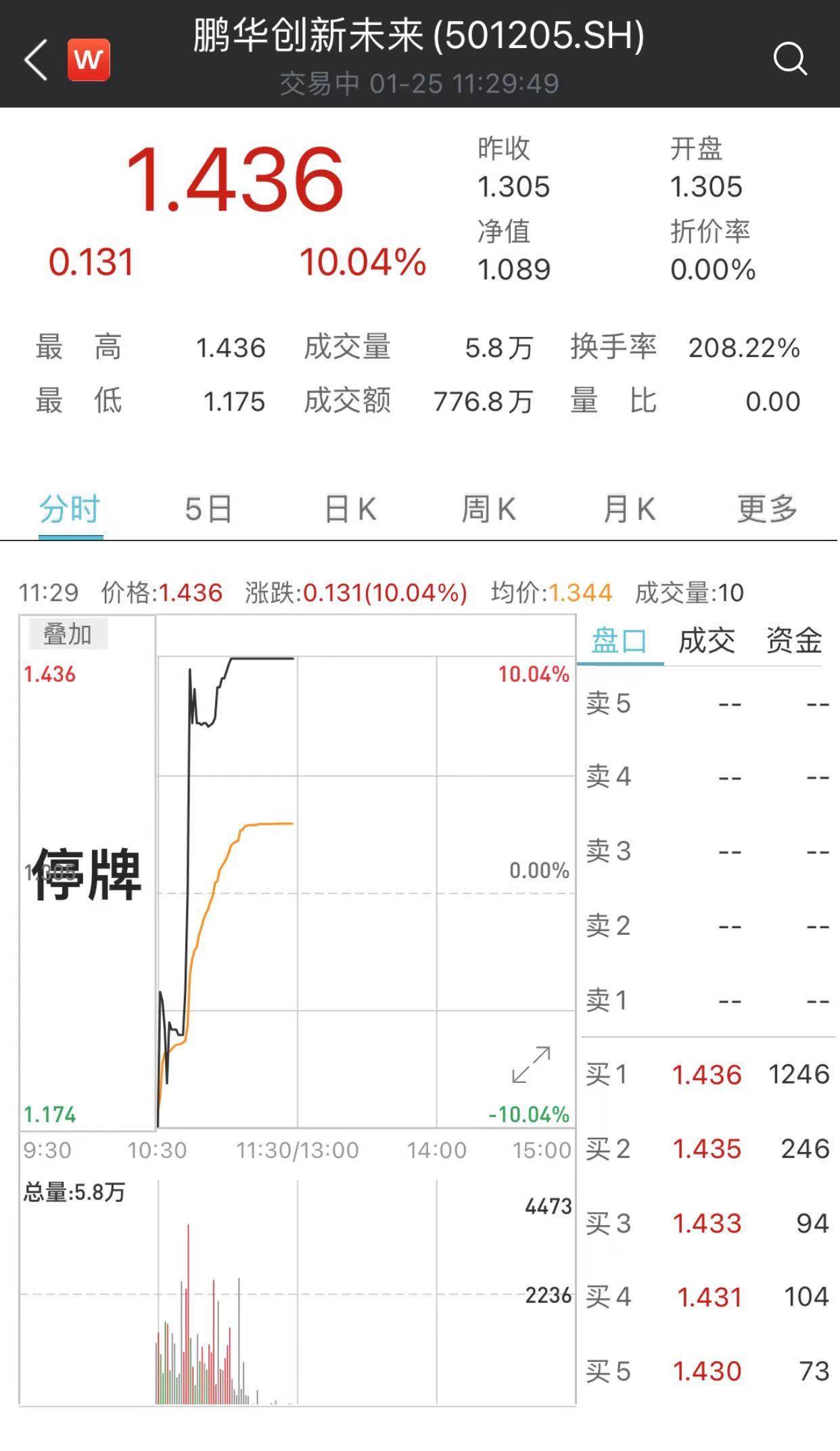 1月22日上午,上交所对5只创新未来基金实施临时停牌,5只基金场内份额在两连板后,当日盘中临时停牌75分钟,并自1月22日13时复牌交易。复牌后,5只创新未来基金场内份额维持涨停价至收盘时。