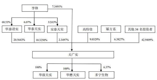资料显示,天广实成立于2003年2月27日,截至招股书签署日,山南华泰君实投资有限公司(“华泰君实”)直接持有20.5643%股份,为控股股东。李锋任董事长、总经理,直接持有7.3491%的股份,并通过华泰君实、华泰天实、安泰天实间接控制股份表决权,合计控制40.5881%的股份表决权,为实际控制人。王钢为实际控制人李锋的一致行动人。